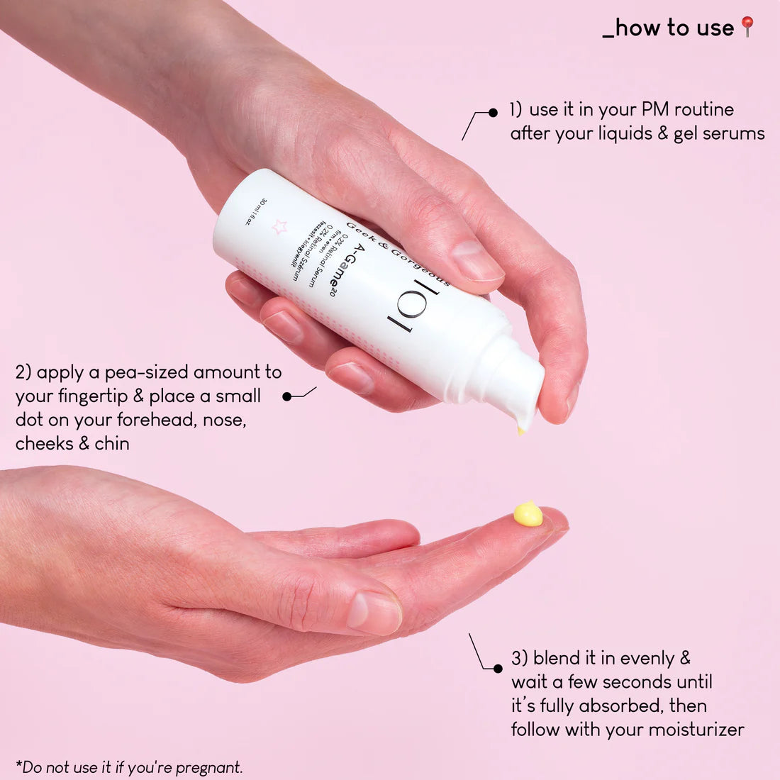 Renk Notu: A-Game'in parlak sarı rengi yüksek Retinal oranından gelir. Genellikle cilde yedirildiğinde kaybolur. Yine de kalıntı olursa, tamamen emilmesine zaman tanıyabilir veya üzerine nemlendirici uygulayabilirsiniz.